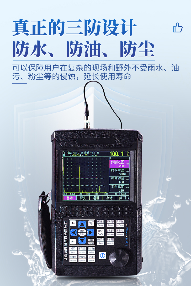 ● 真正的三防設(shè)計,可以保障用戶在復雜的現(xiàn)場和野外不受雨水、油污、粉塵等的侵蝕,讓探傷儀的使用壽命大大延長